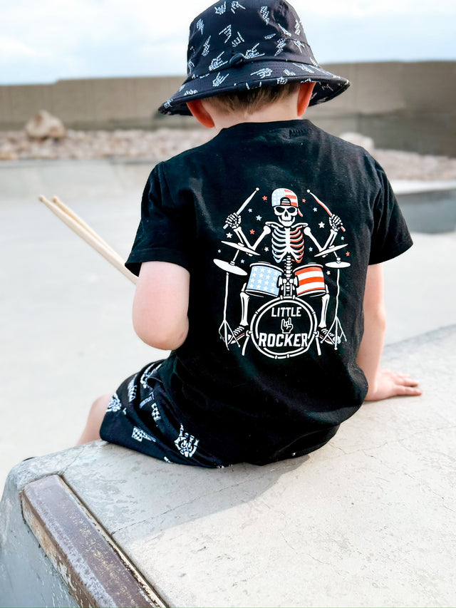 Let your little one rock their patriotic spirit with the Stars and Stripes Drummer Tee from Little Rocker Clothing! Featuring a cool drummer graphic against a stars and stripes backdrop, this tee is perfect for young music lovers and little rockstars. Made from a comfy blend of 95% cotton and 5% spandex, it offers a soft, stretchy fit that moves with them, whether they’re jamming out, playing with friends, or showing off their patriotic pride.