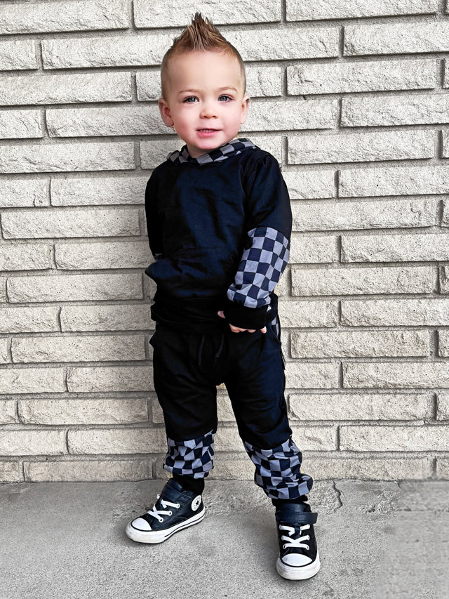 Stand out in the one-of-a-kind Hux Sweatset! Featuring bold checkered patterns on parts of the legs and sleeves, this design is paired with sleek black for the ultimate blend of edgy and classic. Crafted for year-round wear, it’s as versatile as it is stylish. Complete with front pockets and a cozy hood, this sweatset is perfect for lounging, layering, or making a statement wherever you go. Get yours now—because you won’t find this design anywhere else!