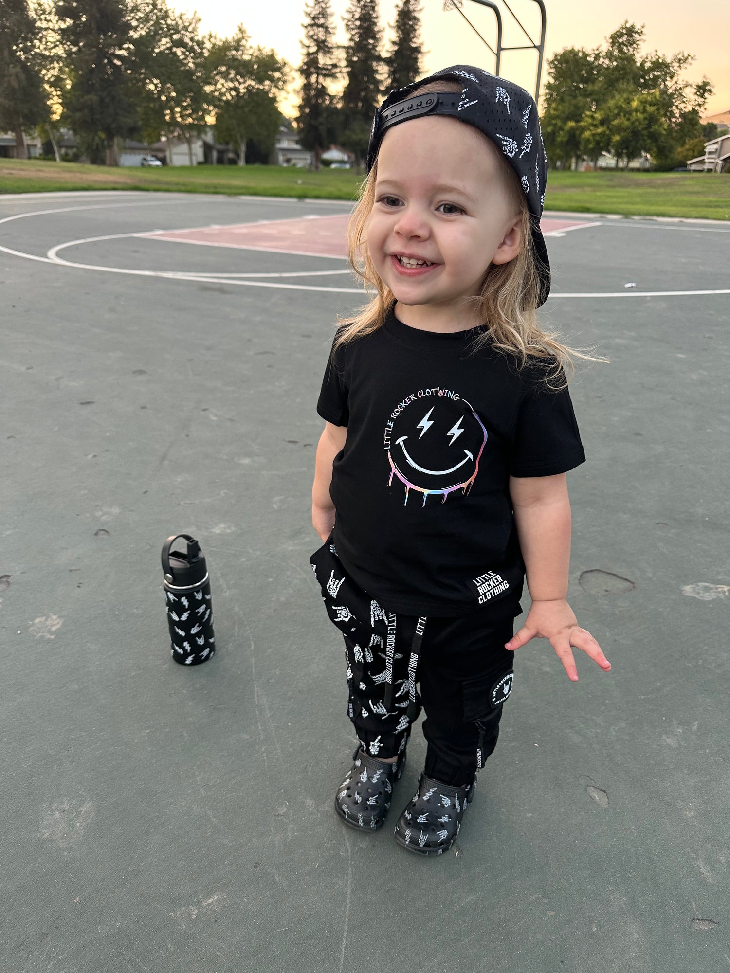 0-3M Onesie and 3-6M Onesie is a front graphic only and it says Rock On Forever in Pastels to Match to Adult pastel shirt