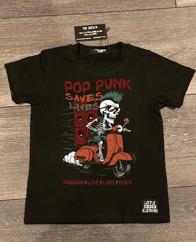 🏍️💀 Pop Punk Saves Lives Tee 🎸 This rad design features a punk rock skelly cruising on a moped, repping the spirit of Passion. Live. Love. Rock. Wear your heart (and rebellion) on your sleeve and keep the punk spirit alive! 🤘🔥 #PopPunkSavesLives #LittleRockerClothing #PassionLiveLoveRock #PunkStyle. Don't forget to grab a matching kids shirt!