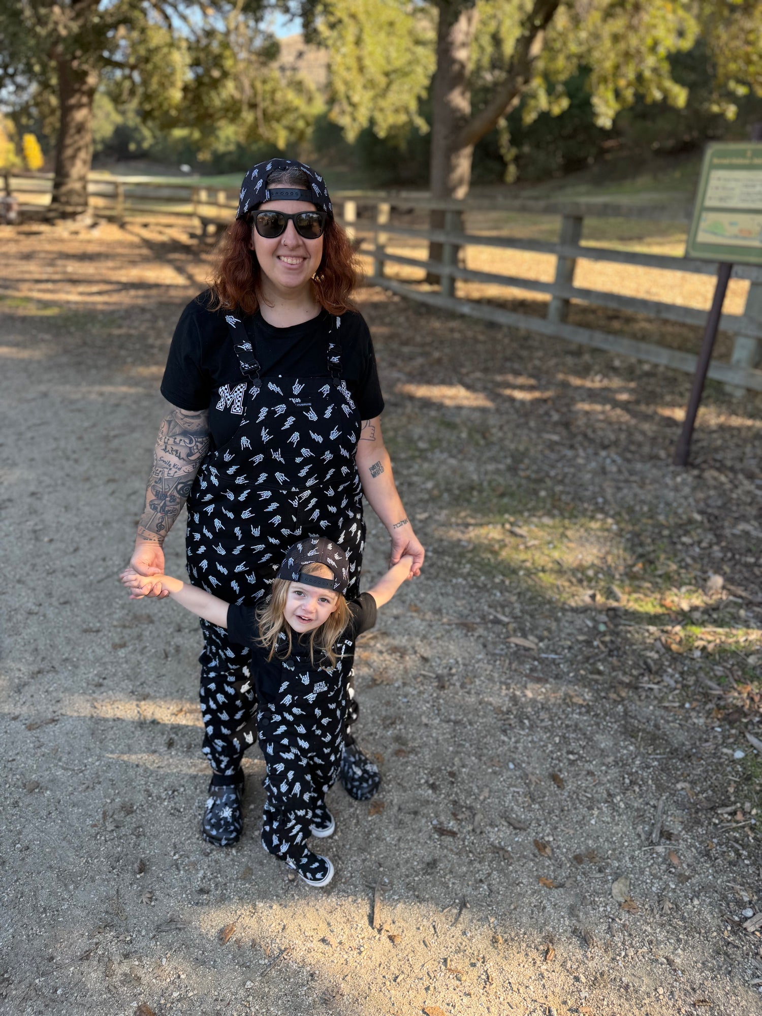 Match your mini in serious style. The Pitstop Overalls – Bolted Bones (Adult) bring our iconic Bolted Bones pattern to a grown-up fit built for comfort, movement, and all-day wear — from festivals and road trips to everyday chaos.