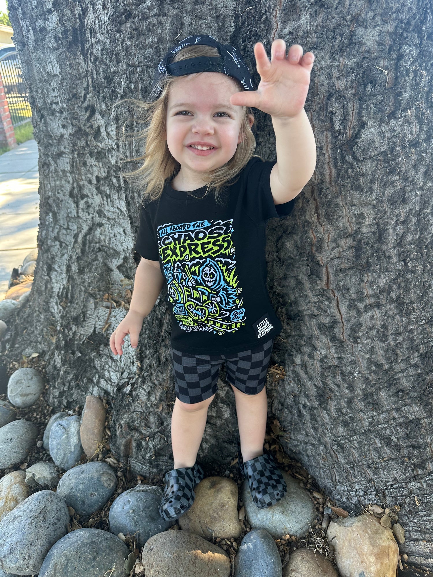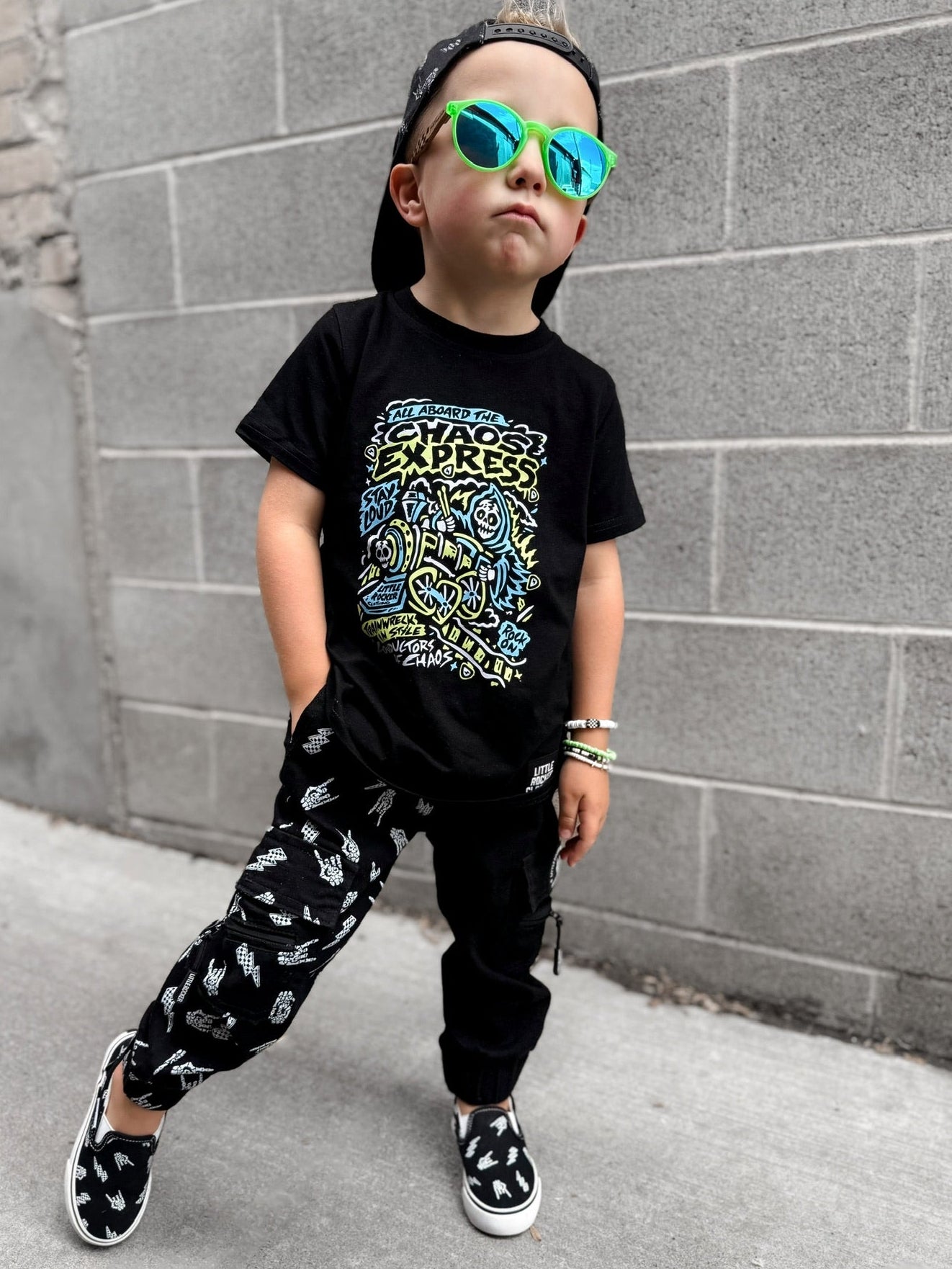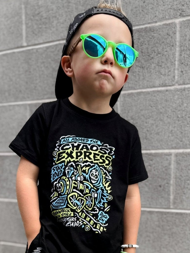 This isn’t your grandma’s train ride. The Chaos Express shirt smashes classic railroad vibes with loud, bright blue + electric green graphics that demand attention. Fueled by distortion, dripping with rebellion, and built for those who live life full throttle — this tee is your ticket to ride off the rails in pure punk rock style.