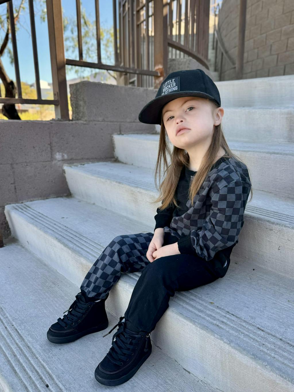 Half checkered, half solid, all rock 'n' roll! Our Half & Half Checkered Sweat Set brings bold style and unbeatable comfort for your little trendsetter. Perfectly paired with our checkered socks for an edgy look that’s straight out of the punk playbook!