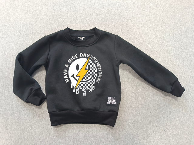 Spread positivity with our "HAVE A NICE DAY" crew, featuring a cheerful checkered/smiley face design. Made from soft, high-quality fabric with fleece lining inside. It is perfect for bringing smiles and good vibes wherever you go.
