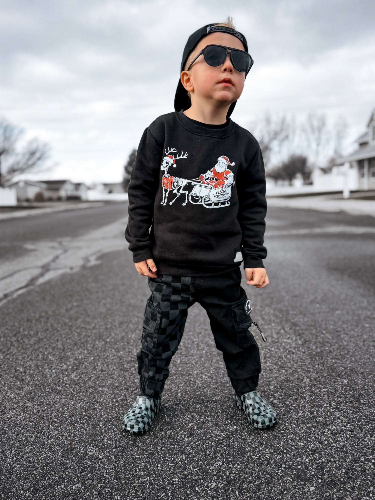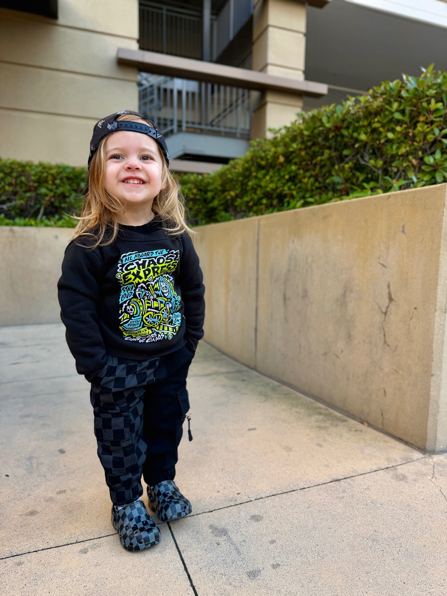 A functional zipper cargo pocket adds utility, while the unique design brings all the attitude your little rocker needs.